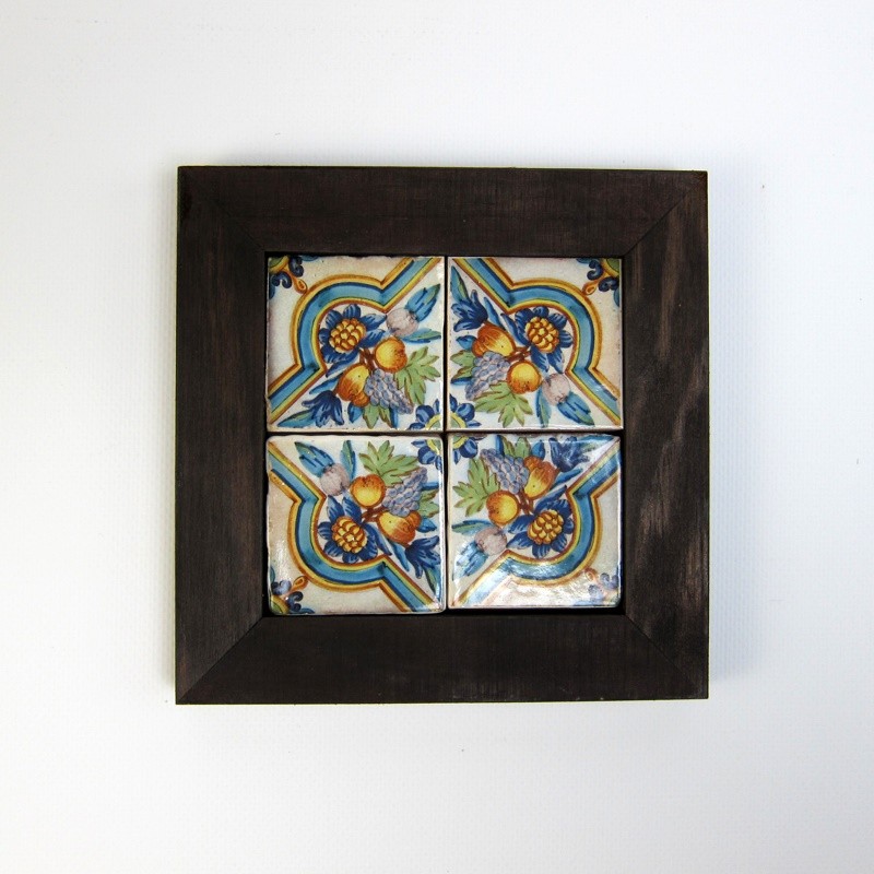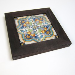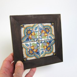 Compuesto por 4 azulejos de 5x5 cm. con marco de madera tinte nogal de 2,5 cm de ancho.