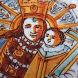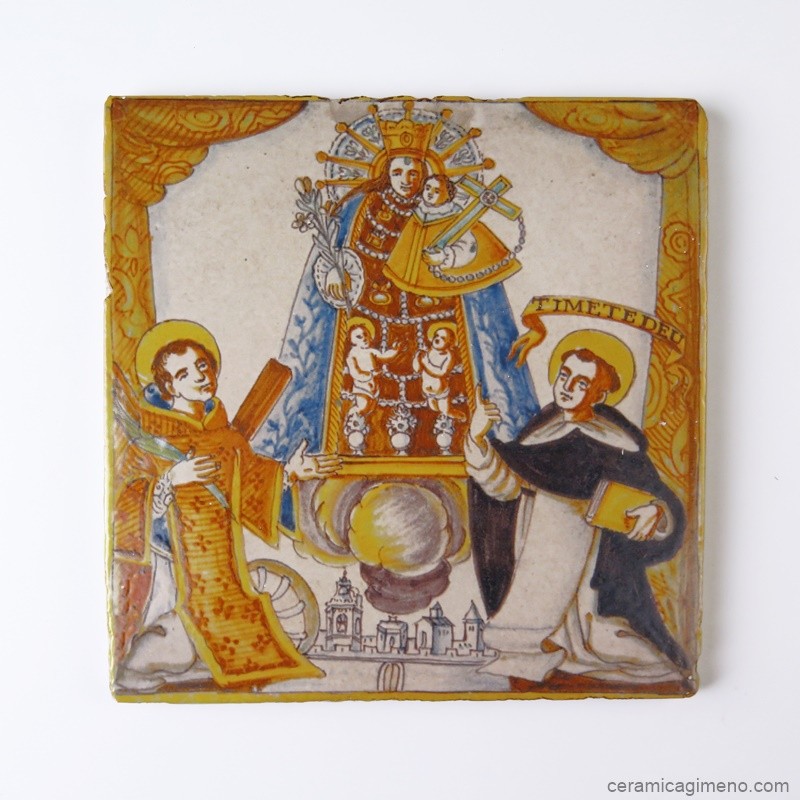 Reproducción de un azulejo de cerámica valenciana del siglo XIX con la tradicional imagen de la Virgen de los Desampardos con San Vicente Mártir y San Vicente Ferrer.